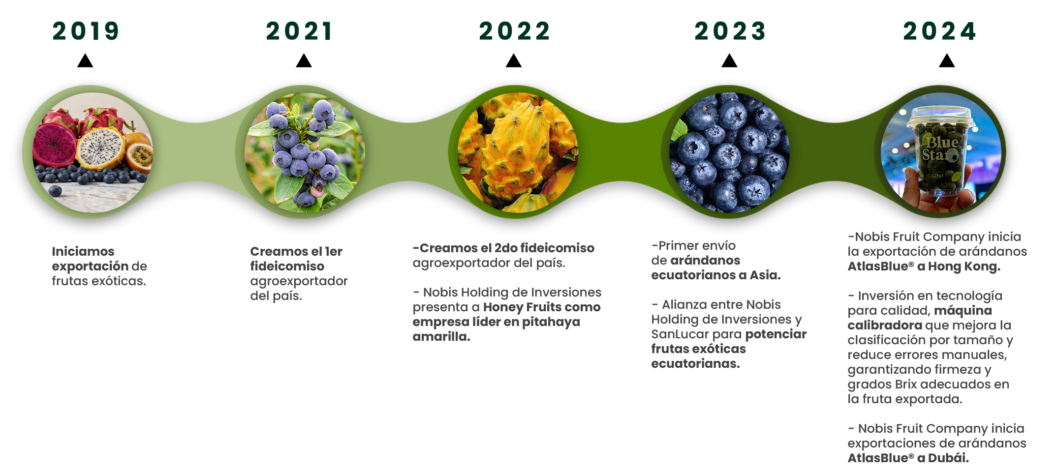 Empresa ecuatoriana fundada en 2021 como parte de la Unidad de Negocios de Agroexportación de Nobis Holding de Inversiones. Se especializa en la producción, empaque y comercialización de frutas tradicionales y no tradicionales (exóticas), como arándanos (AtlasBlue®), (Volcano Berries), pitahaya roja pulpa roja y pulpa blanca. Sus operaciones abarcan la costa y sierra del Ecuador, con centros de empaque propios y producción bajo altos estándares de calidad, inocuidad y seguridad alimentaria. Nobis Fruit Company exporta a mercados de Europa, Asia y otros destinos internacionales, enfocándose en innovación, sostenibilidad y responsabilidad social.
